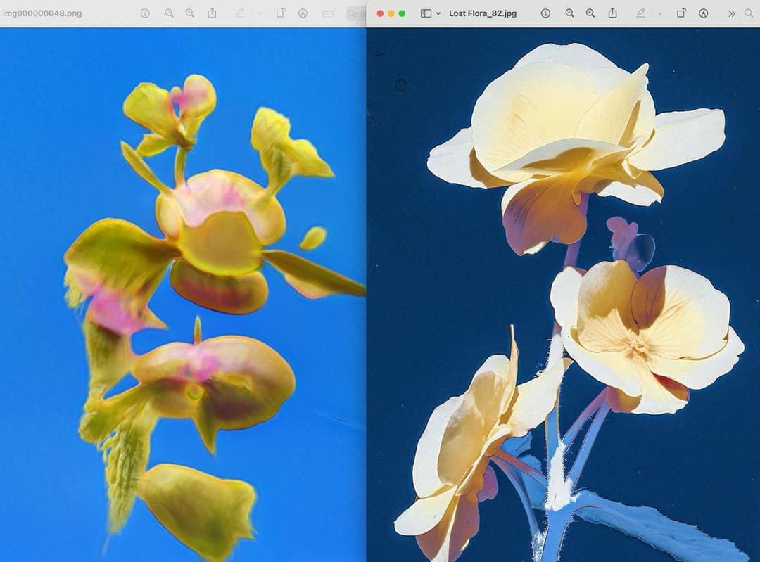 This is because while we can feel more kinship with the definition of the flowers from this new chapter as opposed to the lossy flowers from the first chapter, it would be dangerous to lose sight of the fact that neither the detailed nor the lossy flowers actually exist. Both chapters of this project are evidence of an autonomous system, AI, that is getting exponentially better at helping us imagine, but neither can be mistaken for reality.