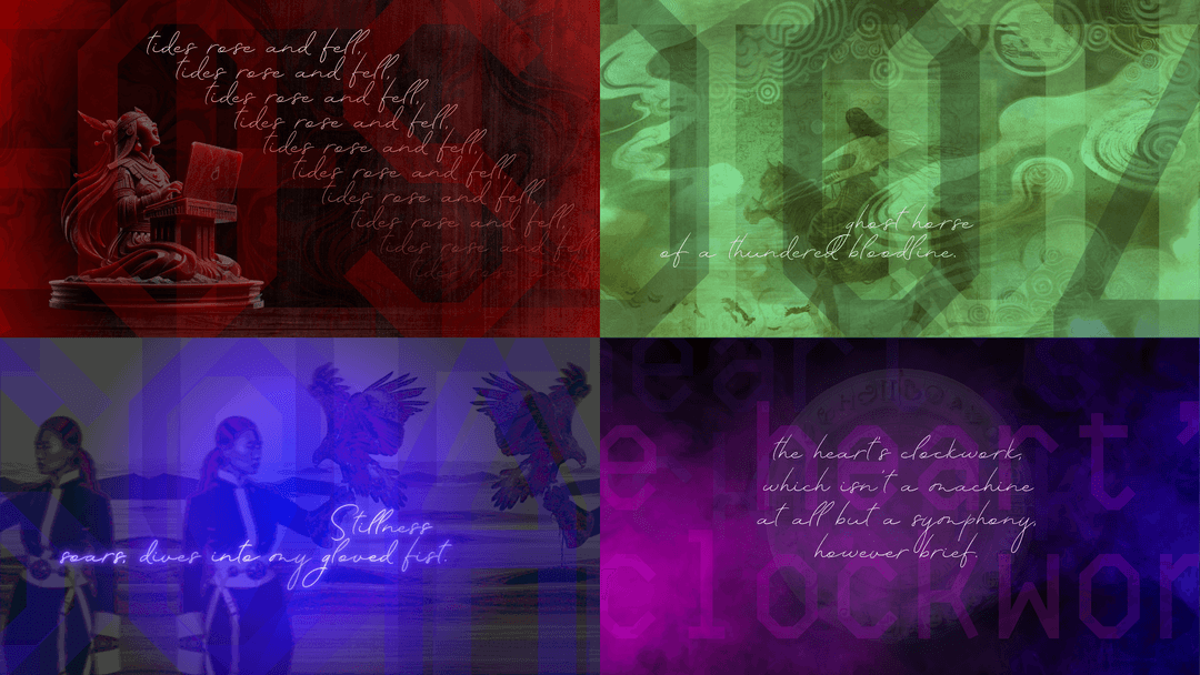 Building on fonts, colors, motifs and techniques from Stiles’ media-rich visual poetry practice, the collection engages a mix of analog and generative tools to alchemize poetry into wordless language -- weaving legible literature with elements forged via text-to-image tools. Individual pages are crafted from digitally handmade papers, inks and textures, and illuminated by “translating” natural language into illustration. Key lines are highlighted as generative metaphors -- e.g., an old book becomes “moth wings from another world,” in both word and image. Intricate digital collage and layers upon layers of motion graphics yield dynamic palimpsests. Each poem is a one-of-a-kind book unto itself, nodding to the golden age of rare tomes, bespoke manuscripts, and the sacred space of the personal library