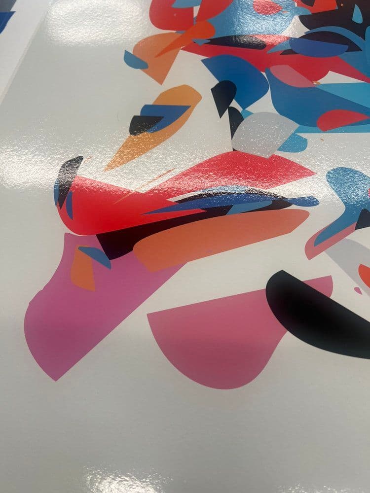 Restraint not only rewarded the on-chain presence and visual outcome on screen, but also the physical. Limitation of colors allowed for specific naming of colors. This enabled printmakers to assist Lars in realizing vivid accurate colors that correspond with the digital colors. The print process for Rhythm & the Machine is special not only for its color accuracy but thanks to the three processes involved. The first layer of the prints are printed digitally. Then a lacquer varnish was added on top. The final layer is screen printed with the named colors.