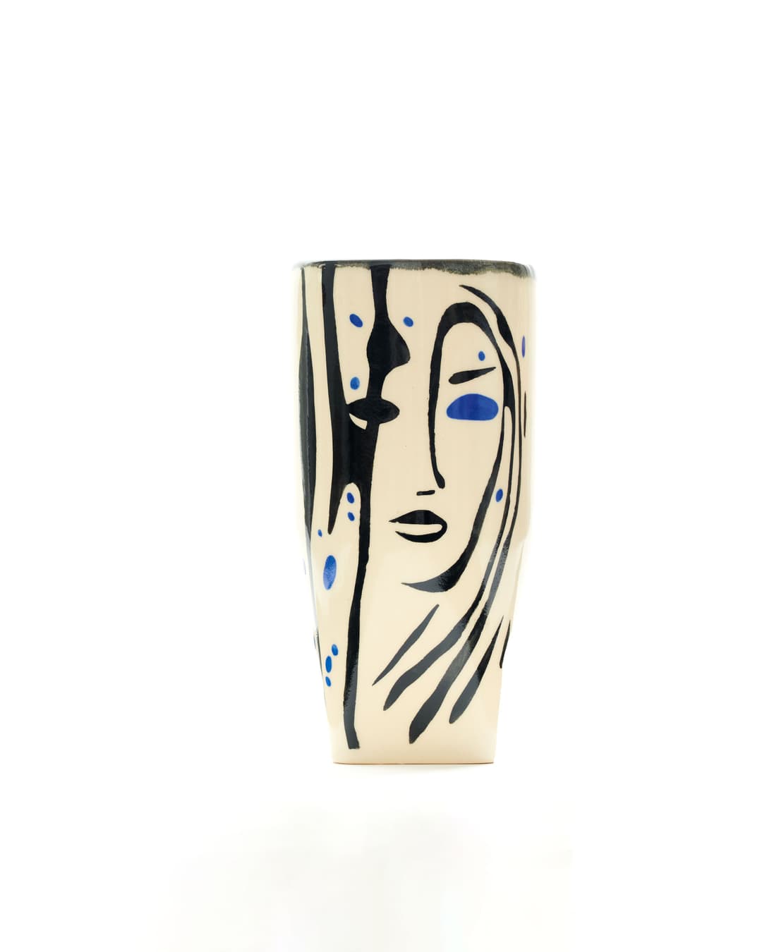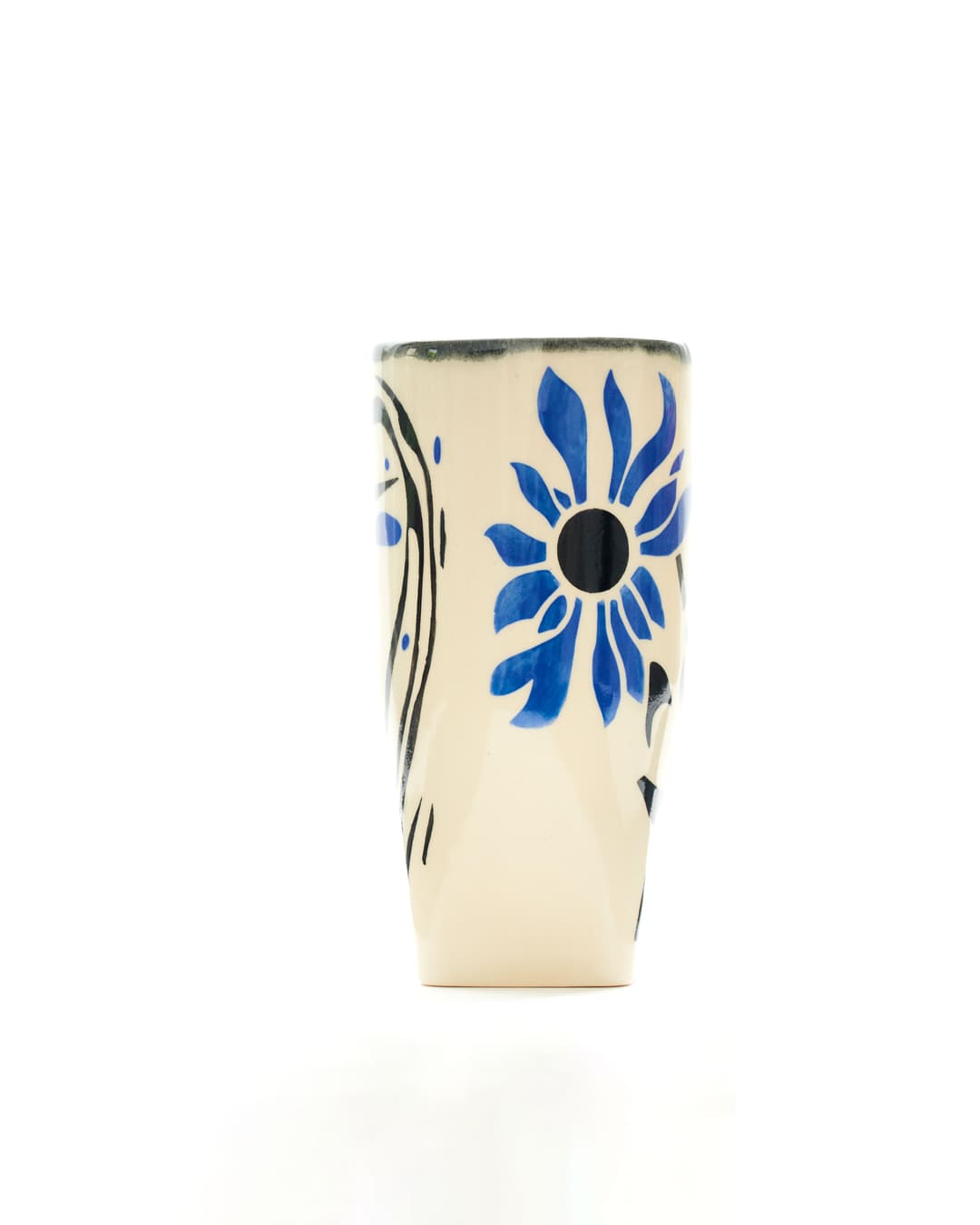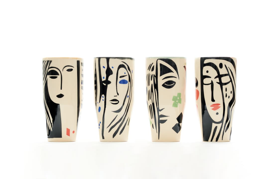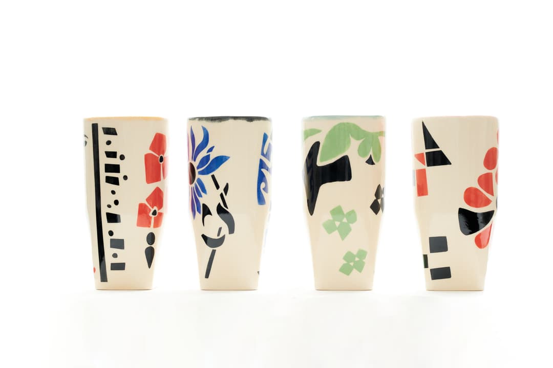 To create her ceramics, Sarin starts by selecting one of her 'GANified' images. She then works in Blender, a 3D modeling tool, to design the particularities of her physical piece, before 3D printing the shape to make a plaster mold for casting her tumblers. Once the form is created and fired in the kiln, Sarin begins painting with underglaze, creating intricate designs that stay true to the colors and patterns of the original GAN work. The pieces are fired again before she adds a transparent glaze for their final, glossy finish. From analog to digital and back again, Sarin skillfully integrates layers of creative nuance along the way. Her tumblers are neither human nor machine generated, they are both, expanding our understanding of what is possible when GANs are embraced as just one of many tools in a multifaceted approach to art-making.