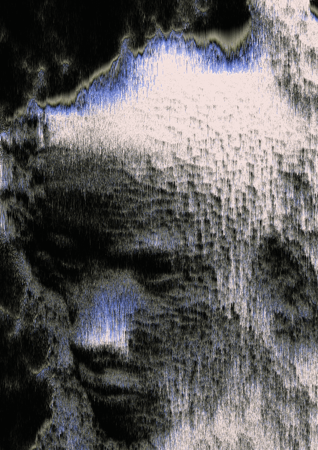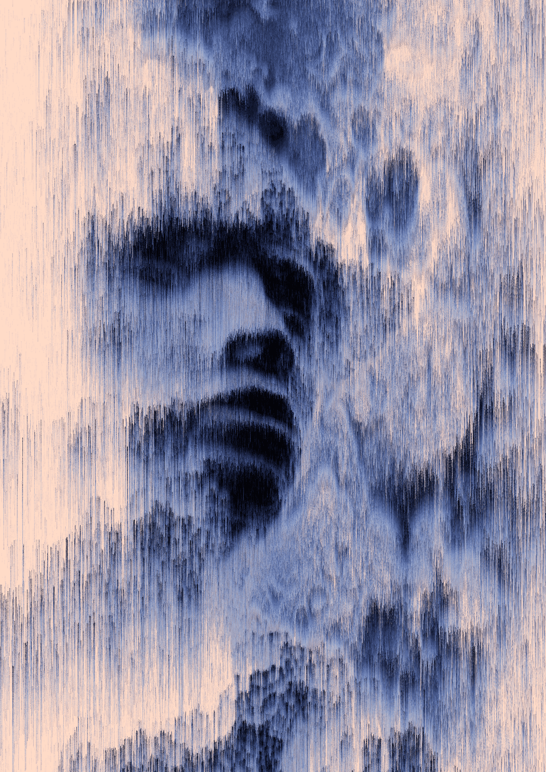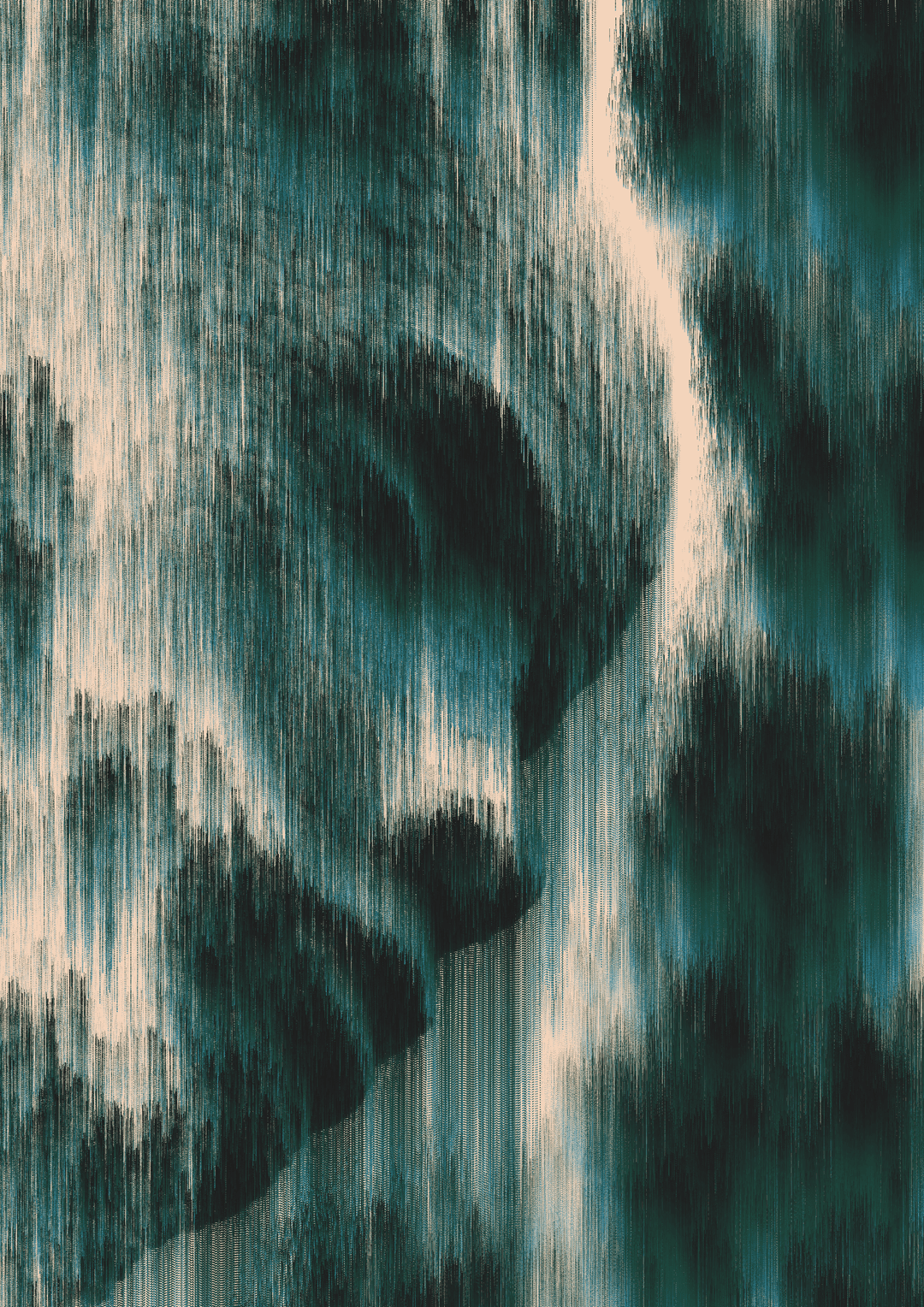 Virga emerges from a multi-layered system, generated entirely with code. Through a sophisticated rendering process, Watkins reimagines rain as cascading streaks of pixels, their shifting density forming textured backdrops against which obscure faces emerge. Some appear clearly defined, as if stepping forward from the deluge, while others dissolve into the rainfall, sketch-like and spectral. This interplay of movement, mystery, and realism recalls the delicate nuances of Old Master sketches, where mere traces of lines evoke profound emotional depth. As the faces morph and distort, they oscillate between human likeness and biomorphic structures like corals and shells, inspired by the intricate scientific sketches of German biologist Ernst Haeckel.