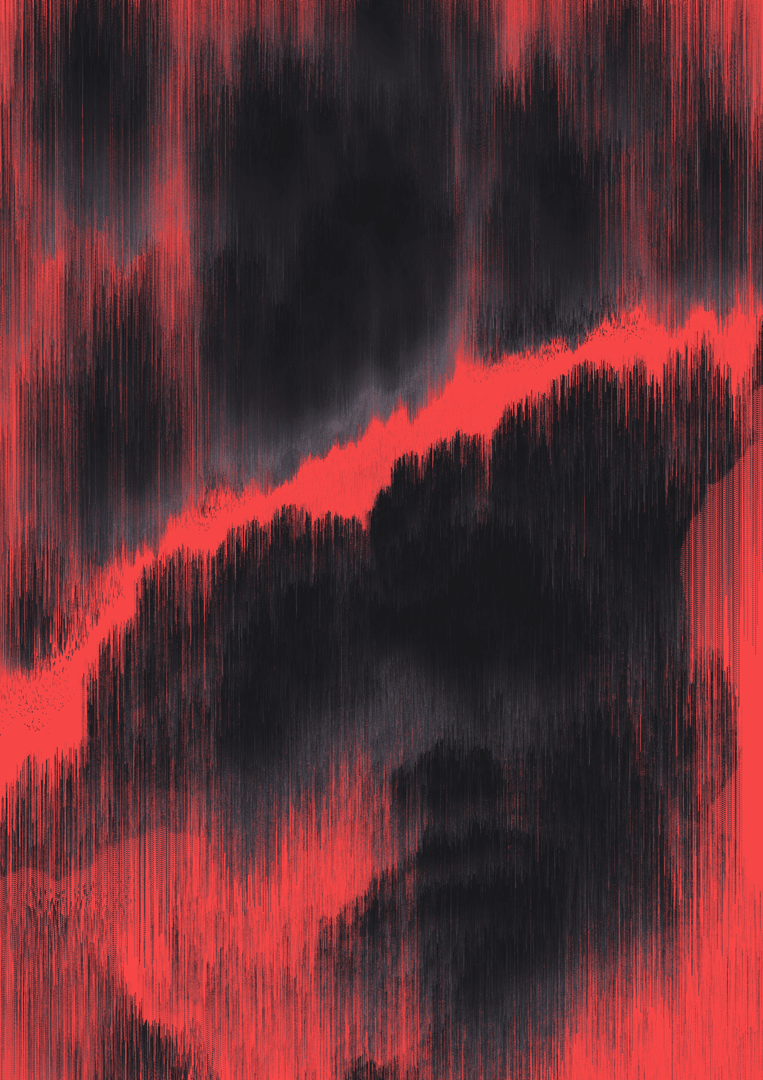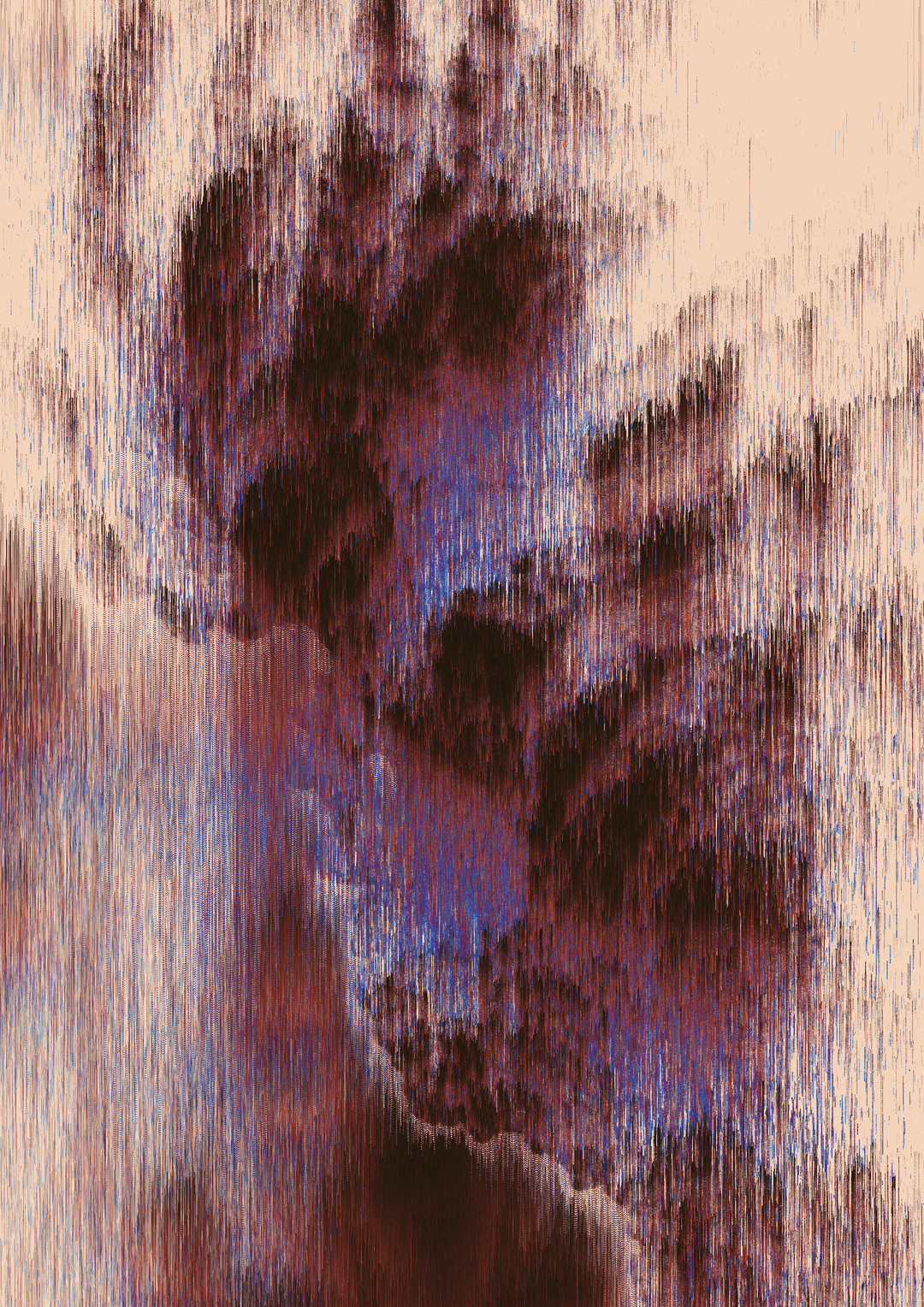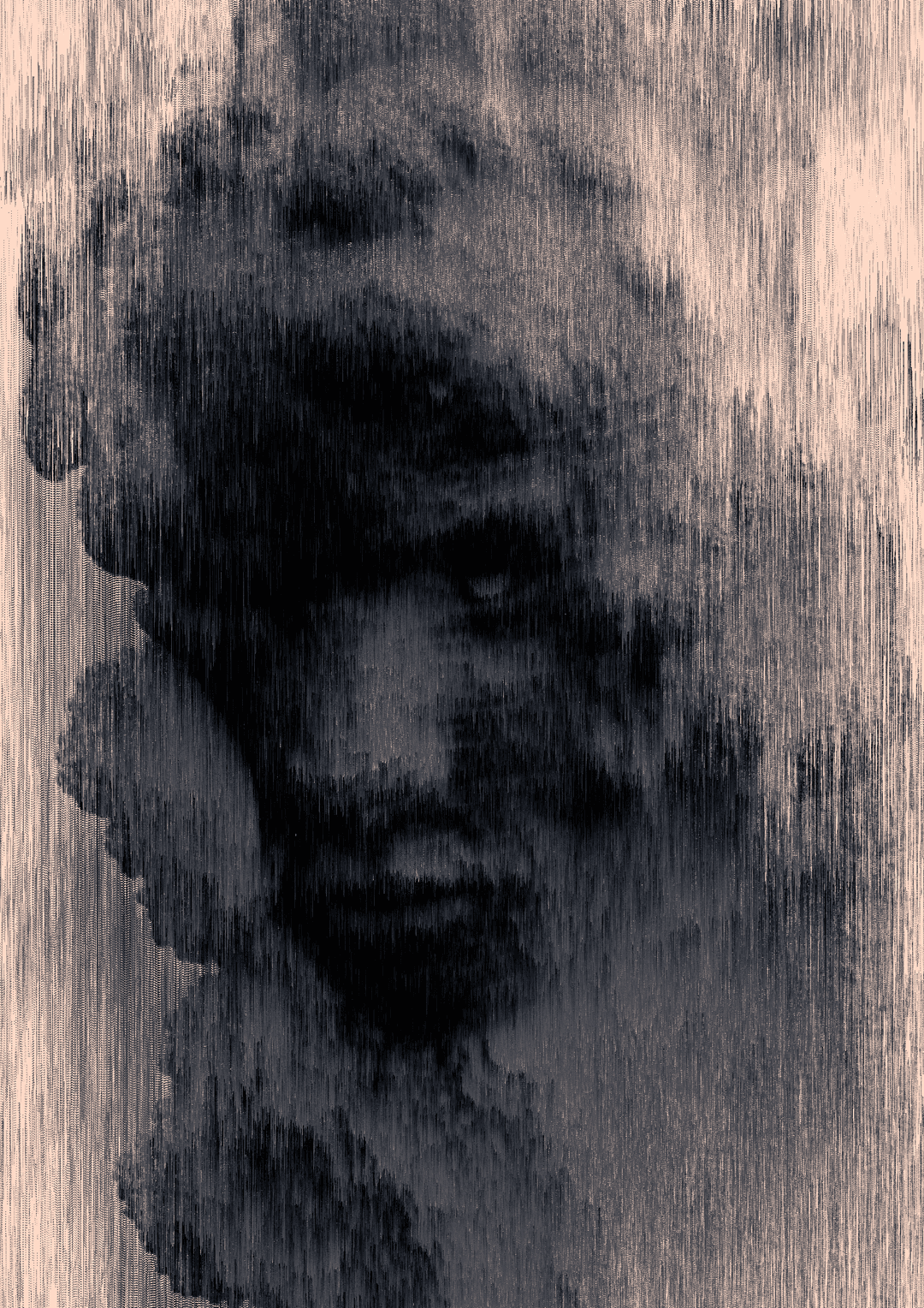 Virga emerges from a multi-layered system, generated entirely with code. Through a sophisticated rendering process, Watkins reimagines rain as cascading streaks of pixels, their shifting density forming textured backdrops against which obscure faces emerge. Some appear clearly defined, as if stepping forward from the deluge, while others dissolve into the rainfall, sketch-like and spectral. This interplay of movement, mystery, and realism recalls the delicate nuances of Old Master sketches, where mere traces of lines evoke profound emotional depth. As the faces morph and distort, they oscillate between human likeness and biomorphic structures like corals and shells, inspired by the intricate scientific sketches of German biologist Ernst Haeckel.